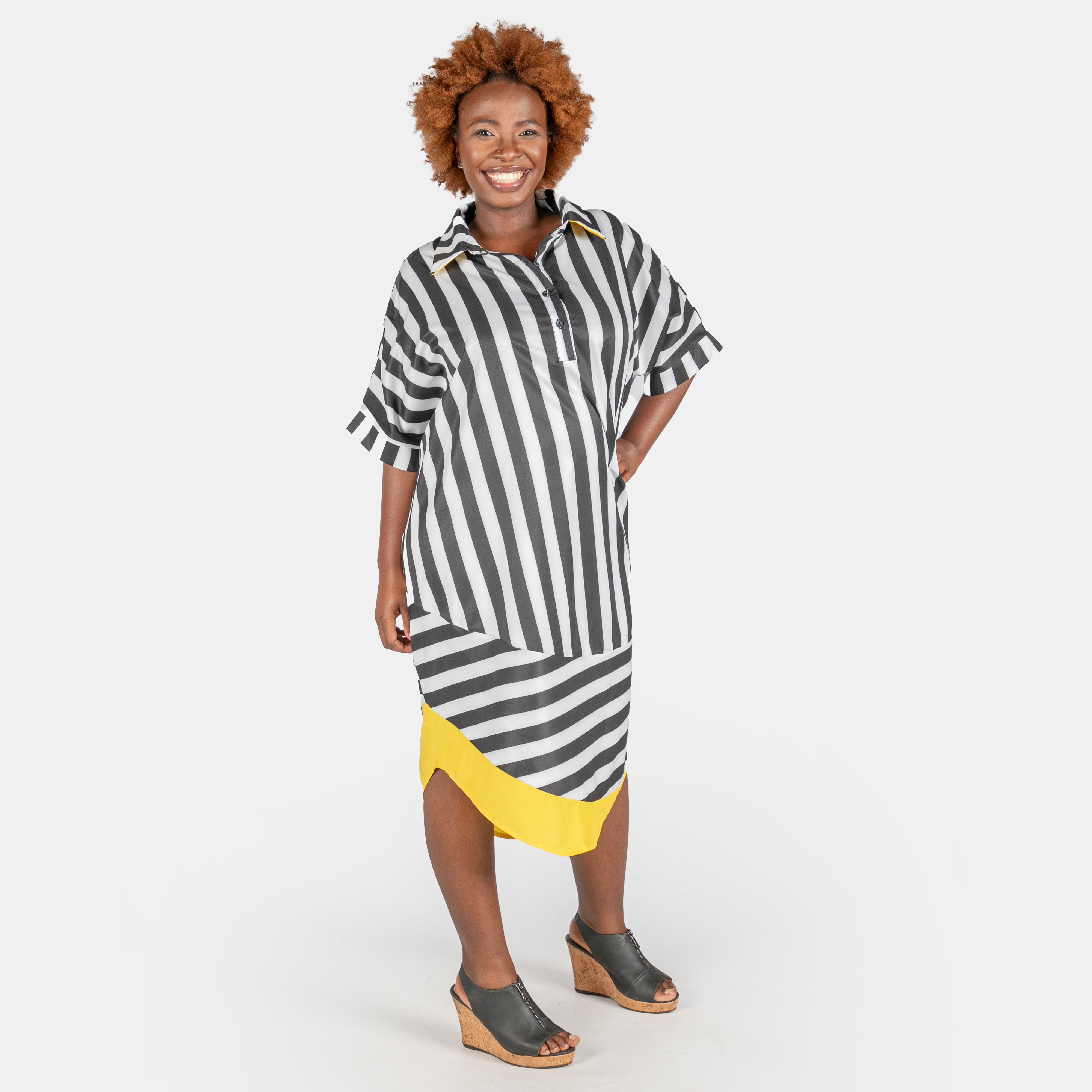 Saskia, your new go-to shift dress that's anything but ordinary. With its relaxed dropped shoulders, charming collar, and partial button-up front, this playful dress keeps things interesting. The three-quarter sleeves strike the perfect balance, while a cheeky burst of yellow dances across horizontal stripes to highlight the dress's cleverly shaped hem. Slip into the sumptuous silky fabric and discover why this dress is ready for whatever adventure comes your way.