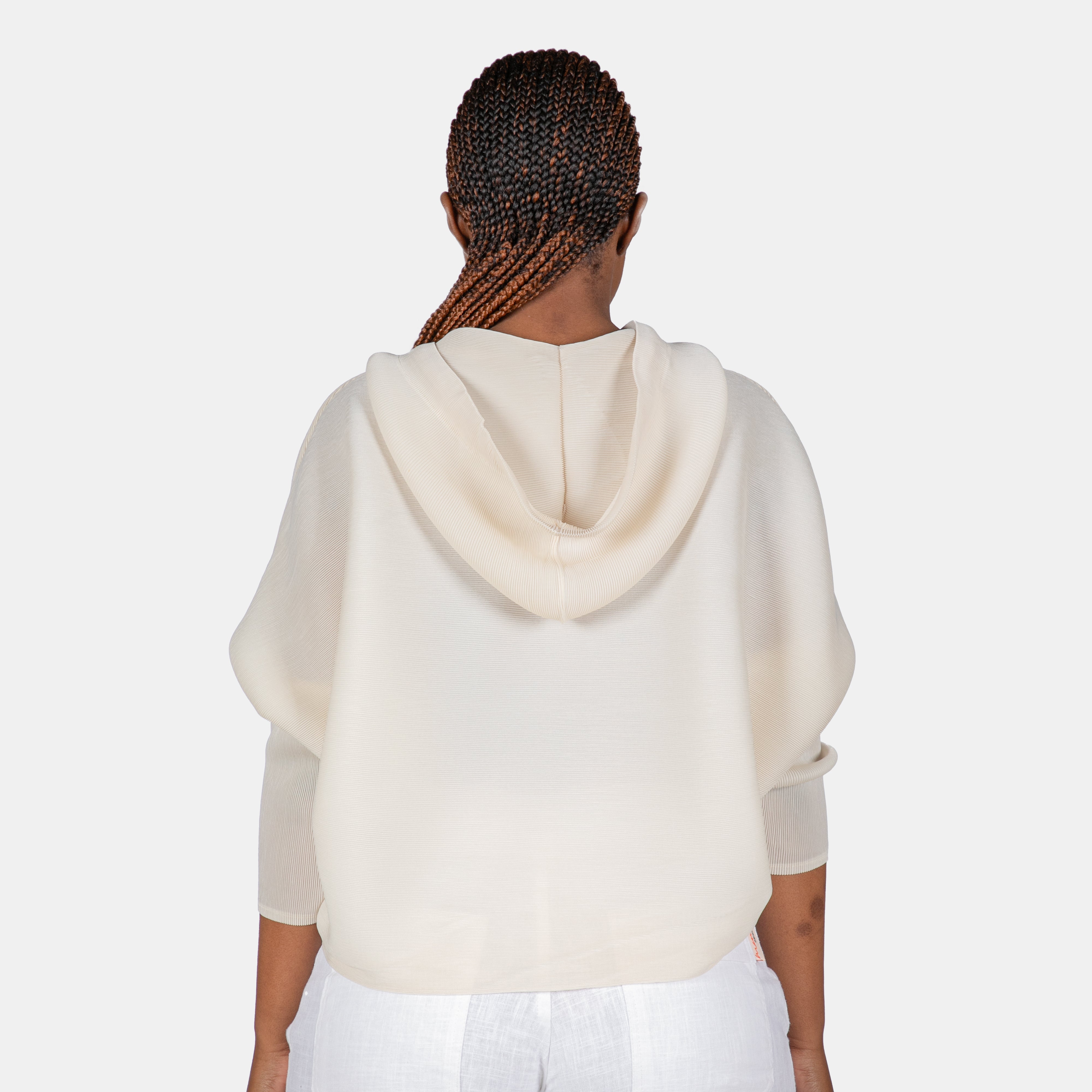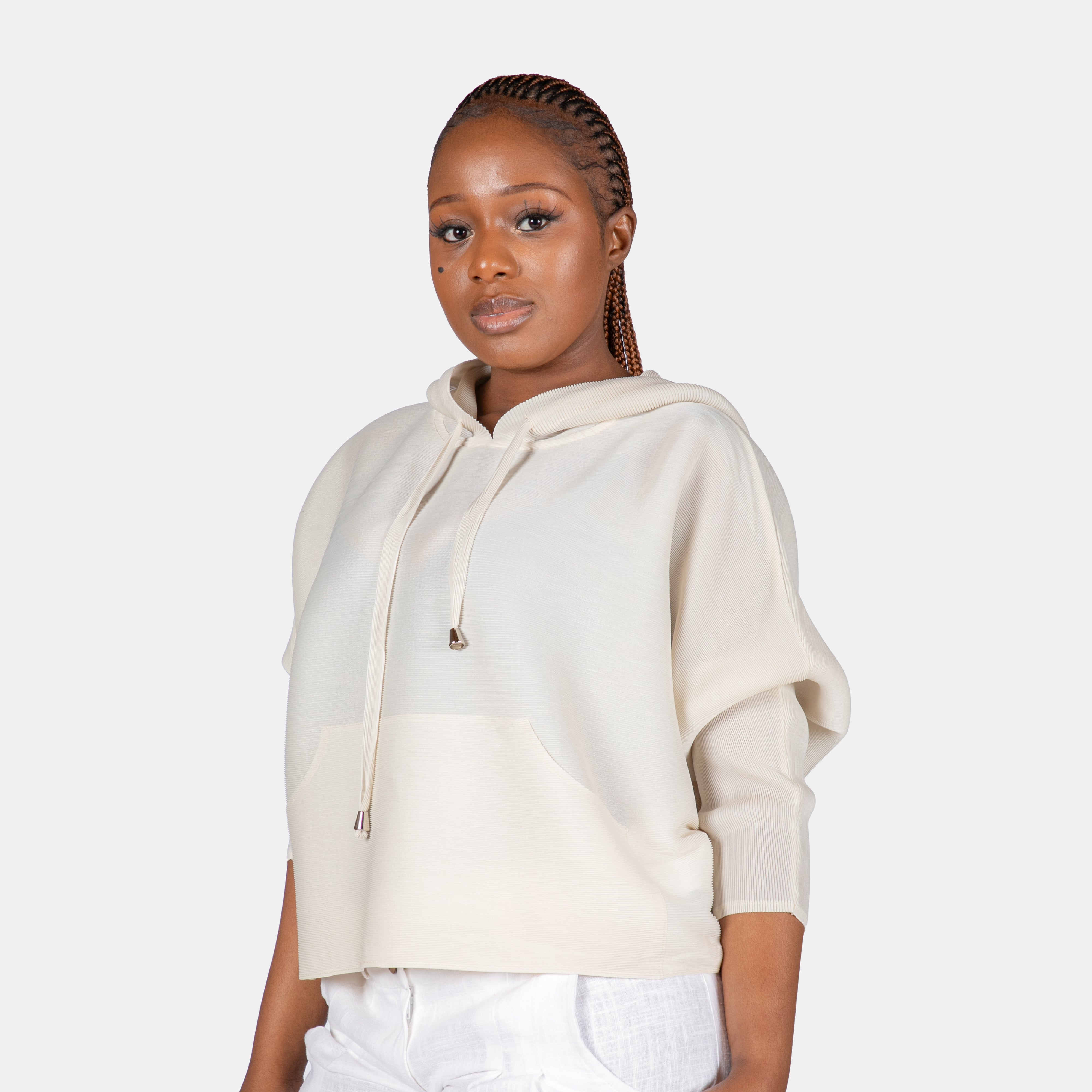 This cropped top is crafted in a textured fabric, has long sleeves and a drawstring hoody. You will notice the hem is shaped with curves on the sides and there is a kangaroo pouch too. Wear Tina with your jeans, shorts, our Big Blue pants or even a skirt. You're gonna love this one, mark our words!